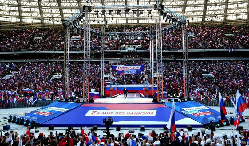 集会は、ロシア軍のウクライナ侵攻を支援し、2014年のクリミア(Crimea)半島併合から8年の節目を記念するために開かれた。放送では、プーチン氏が「作戦の開始が偶然にも、わが国の優秀な軍人の一人の誕生日と重なり……」と述べていたところで突然、映像が切り替わり、同じイベントで先に行われた愛国的音楽のコンサートの様子が流れ始めた。国営テレビは約10分後、演説を頭から最後まで放送した。