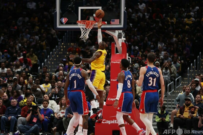 マローン氏の記録更新まであと20点に迫って敵地でのワシントン・ウィザーズ(Washington Wizards)戦に臨んだジェームズは、いつも通りの大車輪の活躍を見せ、38得点10リバウンドをマーク。通算3万6947点としてマローン氏を上回った。しかしチームは119-127で敗れ、6連敗中のウィザーズに白星を献上した。