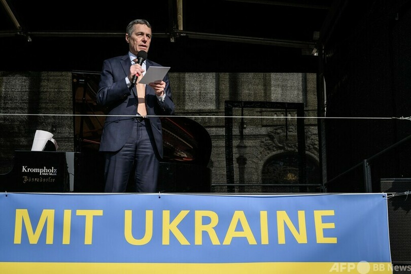 集会には数千人が参加。スイスのイグナツィオ・カシス(Ignazio Cassis)大統領も壇上で演説し、「ウォロディミルよ、抵抗に向けたあなたがたの意志や難局を乗り越えようとするウクライナ国民の姿勢に深い感銘を受けた」とエールを送った。(c)AFP