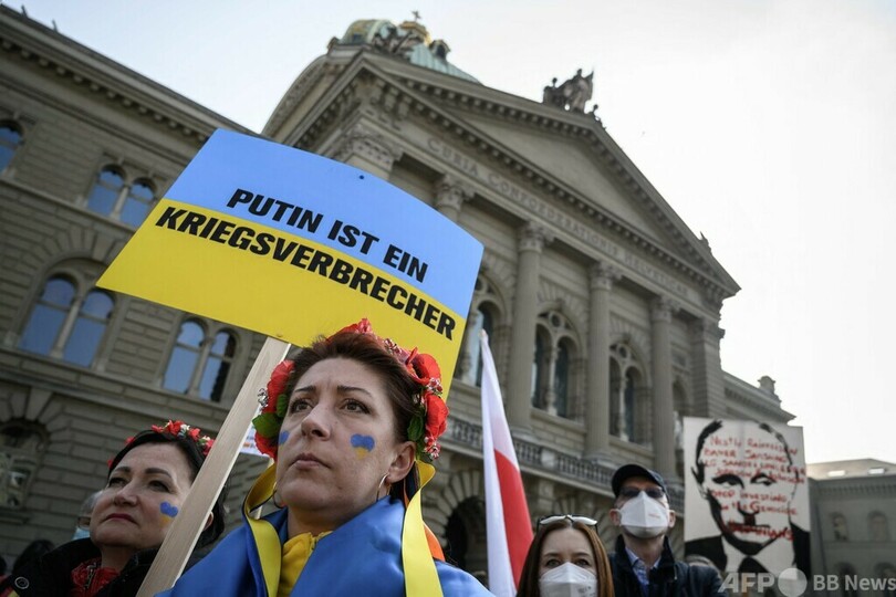 集会には数千人が参加。スイスのイグナツィオ・カシス(Ignazio Cassis)大統領も壇上で演説し、「ウォロディミルよ、抵抗に向けたあなたがたの意志や難局を乗り越えようとするウクライナ国民の姿勢に深い感銘を受けた」とエールを送った。(c)AFP