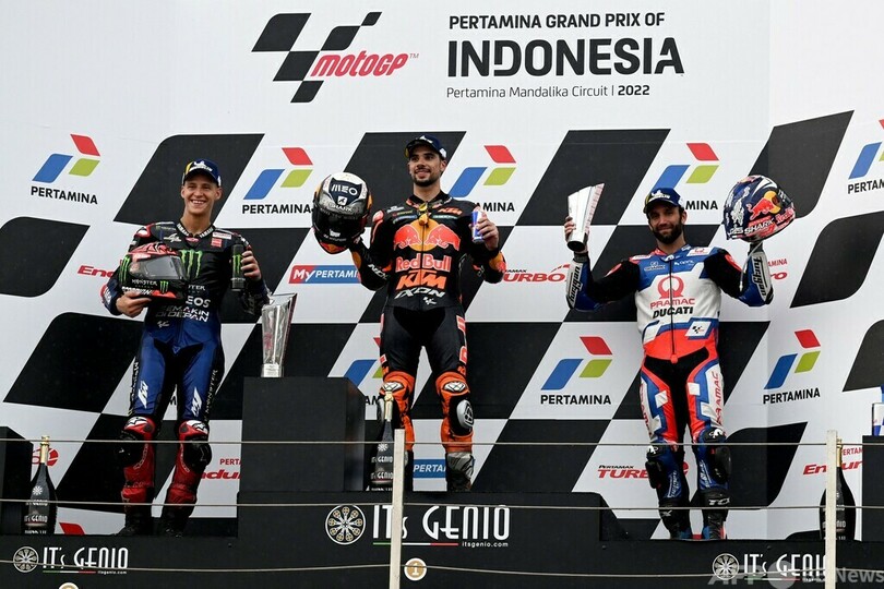 【3月21日 AFP】ロードレース世界選手権、第2戦インドネシアGPは20日、MotoGPクラス決勝が行われ、レッドブルKTMファクトリー・レーシング(Red Bull KTM Factory Racing)のミゲル・オリベイラ(Miguel Oliveira、ポルトガル)が雨の厳しい条件の中優勝し、トロフィーを赤ん坊の娘にささげた。