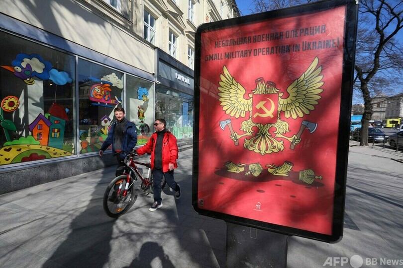 ある広告板には、ウクライナの紋章を付けたブーツに踏まれてゆがんだロシアのウラジーミル・プーチン(Vladimir Putin)大統領の顔が描かれていた。