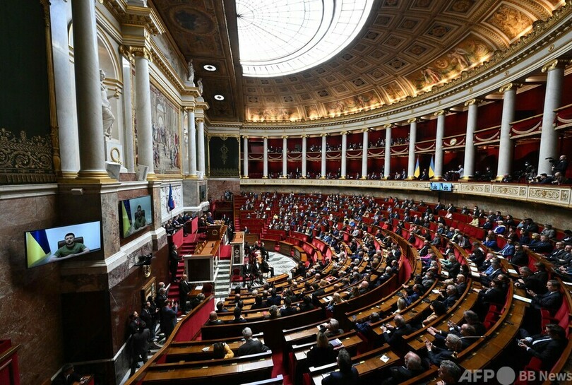 ゼレンスキー氏はここ数週間にわたり、各国の支援を得るために西側諸国の議会で演説を行っている。フランス議員は演説開始前、ウクライナと同国駐仏大使に3回のスタンディングオベーションを送った。