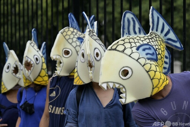 【3月29日 AFP】「世界水の日(International Water Day)」に、魚の仮装をしてデモをする気候変動の危機を訴える団体「絶滅への反逆(Extinction Rebellion)」のメンバーら。アルゼンチン・ブエノスアイレスで。(c)AFP