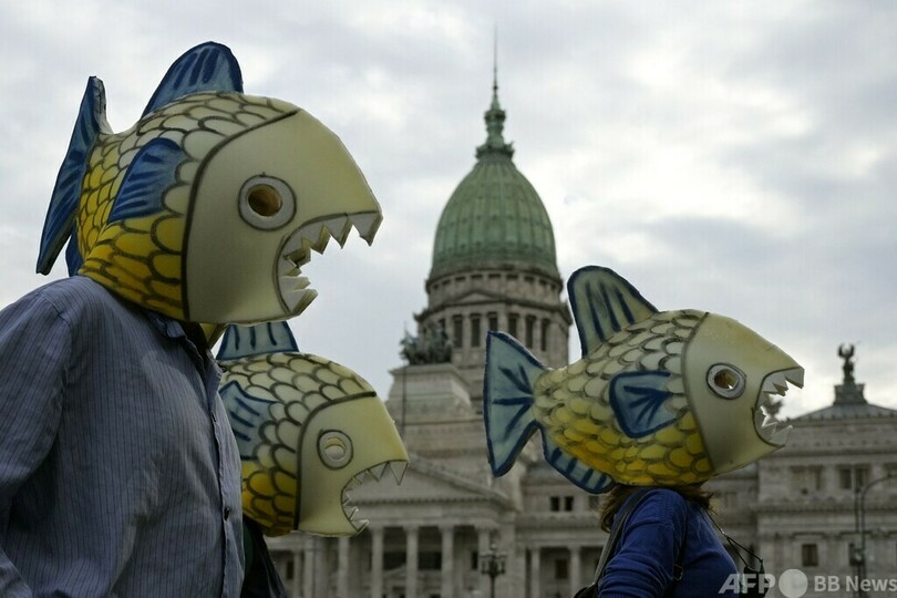 【3月29日 AFP】「世界水の日(International Water Day)」に、魚の仮装をしてデモをする気候変動の危機を訴える団体「絶滅への反逆(Extinction Rebellion)」のメンバーら。アルゼンチン・ブエノスアイレスで。(c)AFP