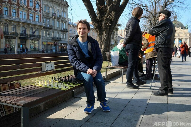 リビウはまたウクライナの「チェスの都」とも言われ、ベンチでは市民がチェスを楽しんでいる。グランドマスターで、ウクライナチャンピオンのアンドレイ・ボロキチン(Andrei Volokitin)さんもその一人だ。(c)AFP