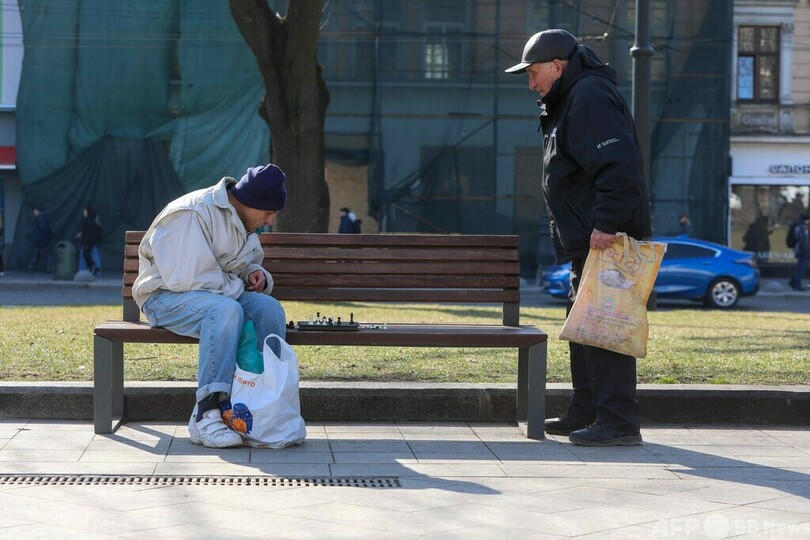 リビウはまたウクライナの「チェスの都」とも言われ、ベンチでは市民がチェスを楽しんでいる。グランドマスターで、ウクライナチャンピオンのアンドレイ・ボロキチン(Andrei Volokitin)さんもその一人だ。(c)AFP
