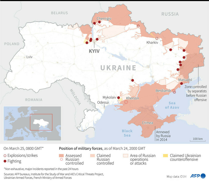 【3月25日 AFP】(更新)ロシア国防省は25日、ウクライナの首都キエフ近郊の村にある最大の軍事用燃料貯蔵施設を破壊したと発表した。