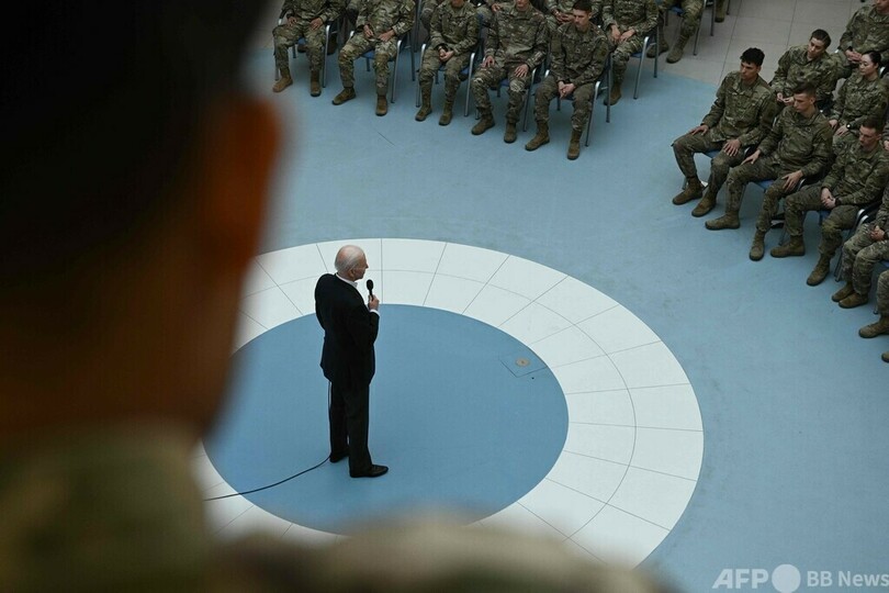 バイデン氏は、現地に駐留する米軍兵士や、ウクライナから多数流入した難民の支援に当たる活動家との会合で、ウクライナ人がロシアに対し示した「気骨」を称賛。ライフル銃を持ち戦車に立ち向かった女性の例に言及し、「まるで天安門広場で起きたことのようだ」と語った。