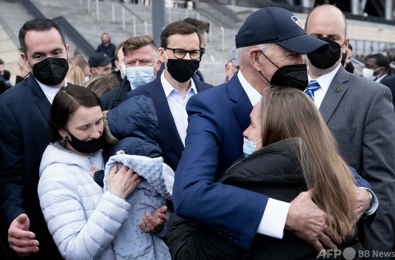 バイデン氏はこれに先立ち、ワルシャワ市内でウクライナ難民と面会した際、プーチン氏を「虐殺者」と呼び批判していた。(c)AFP