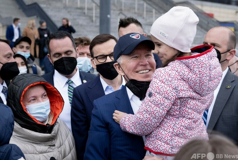 バイデン氏はこれに先立ち、ワルシャワ市内でウクライナ難民と面会した際、プーチン氏を「虐殺者」と呼び批判していた。(c)AFP