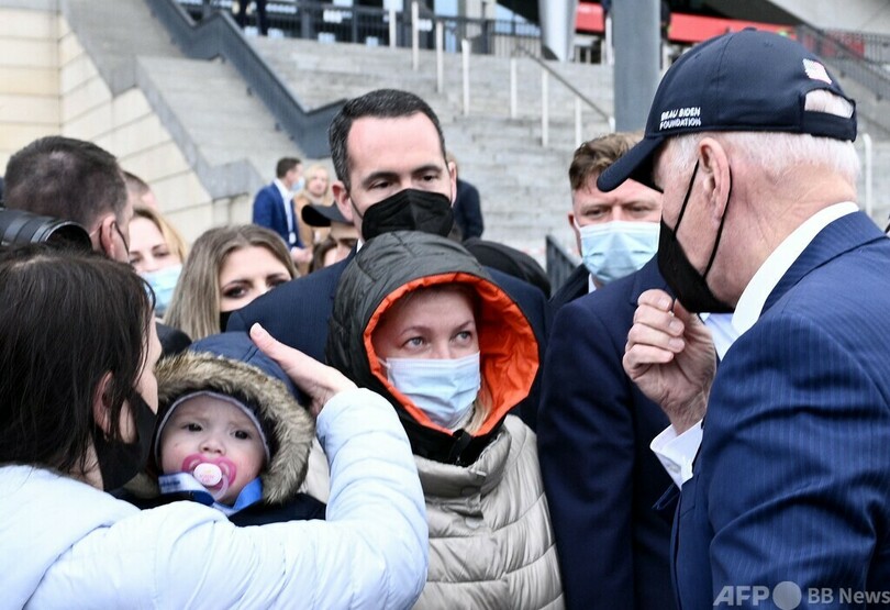 バイデン氏はこれに先立ち、ワルシャワ市内でウクライナ難民と面会した際、プーチン氏を「虐殺者」と呼び批判していた。(c)AFP