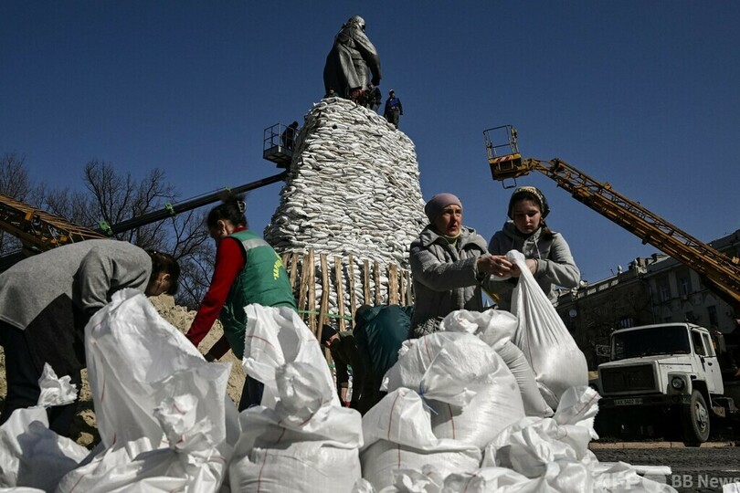 市当局によると、ロシア軍に破壊された建物は1143棟に上り、うち998棟が一戸建て住宅や集合住宅だ。立像や記念碑の周囲には、空爆から守るため土のうが積み上げられている。