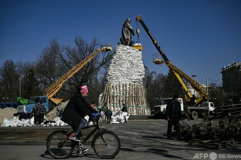 市当局によると、ロシア軍に破壊された建物は1143棟に上り、うち998棟が一戸建て住宅や集合住宅だ。立像や記念碑の周囲には、空爆から守るため土のうが積み上げられている。