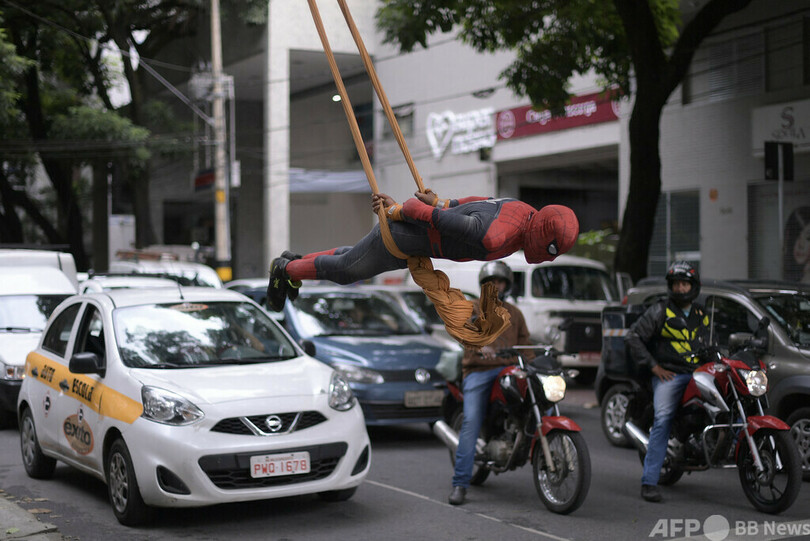 【今日の1枚】車道で宙に舞うスパイダーマン、ブラジル