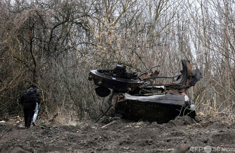 【3月31日 AFP】ウクライナの首都キエフをめぐる戦いは市周辺の村や町が舞台となっている。規模の小さな農村、ルキヤノフカ(Lukianivka)もそのうちの一つで、崩れ落ちた教会のそばには、焼け焦げた戦車と土をかけられたロシア兵の遺体が残されている。