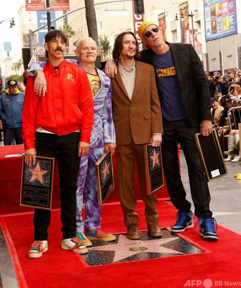 【4月1日 AFP】米ロックバンド、レッド・ホット・チリ・ペッパーズ(Red Hot Chili Peppers)が3月31日、ハリウッドの殿堂入りを果たし、米カリフォルニア州ロサンゼルスにある「ハリウッド・ウォーク・オブ・フェーム(Hollywood Walk of Fame)」の星形プレートを獲得した。(c)AFP
