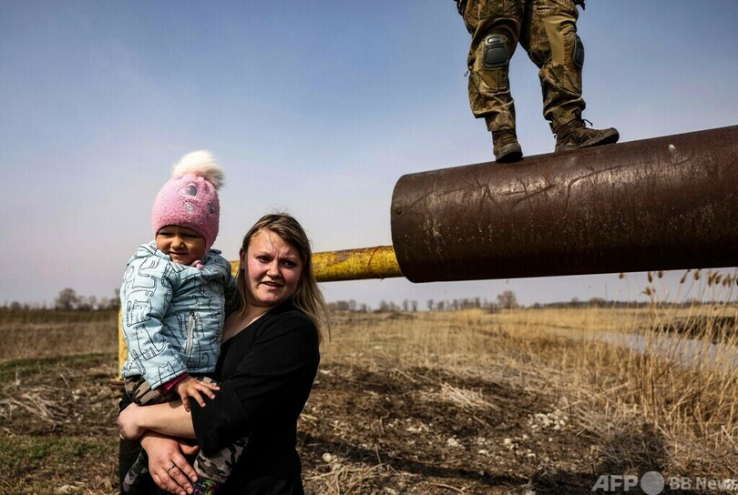 ウクライナ侵攻、パイプライン渡って逃げる家族
