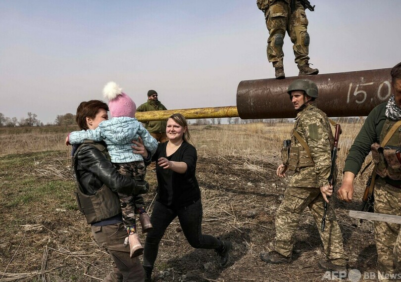ウクライナ侵攻、パイプライン渡って逃げる家族