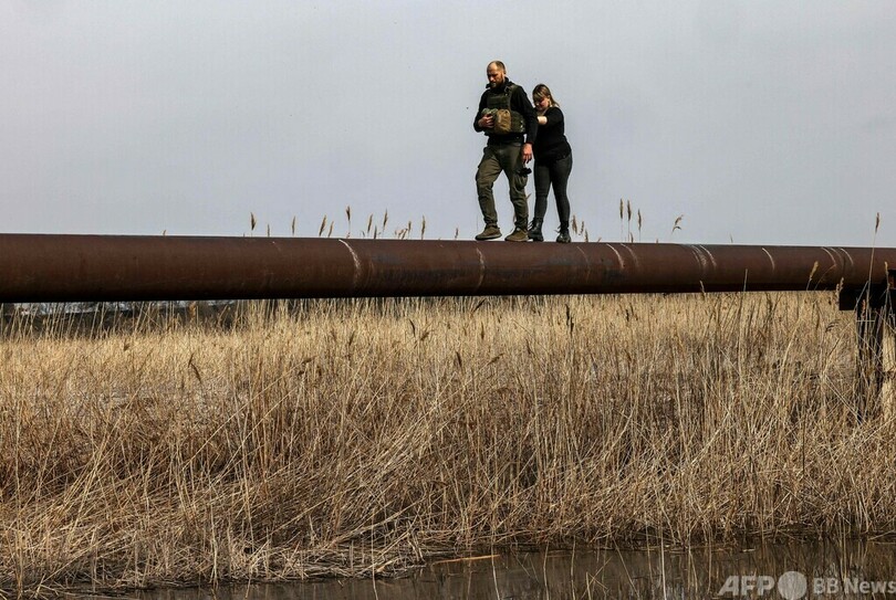 ウクライナ侵攻、パイプライン渡って逃げる家族