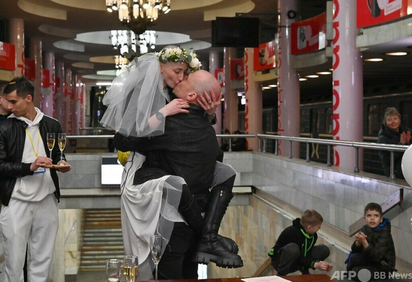 【4月5日 AFP】ウクライナ第2の都市ハルキウ(Kharkiv)中心部のがれきの中で3日、新婚のアントン・ソコロウ(Anton Sokolov)さんとナスチャ・グラチェーワ(Nastya Gracheva)さんが写真撮影に応じた。花嫁のグラチェーワさんは、黒いジャケットの上から羽織ったドレス姿で写真に納まった。