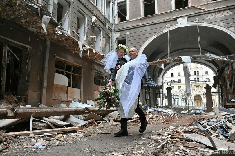 【4月5日 AFP】ウクライナ第2の都市ハルキウ(Kharkiv)中心部のがれきの中で3日、新婚のアントン・ソコロウ(Anton Sokolov)さんとナスチャ・グラチェーワ(Nastya Gracheva)さんが写真撮影に応じた。花嫁のグラチェーワさんは、黒いジャケットの上から羽織ったドレス姿で写真に納まった。