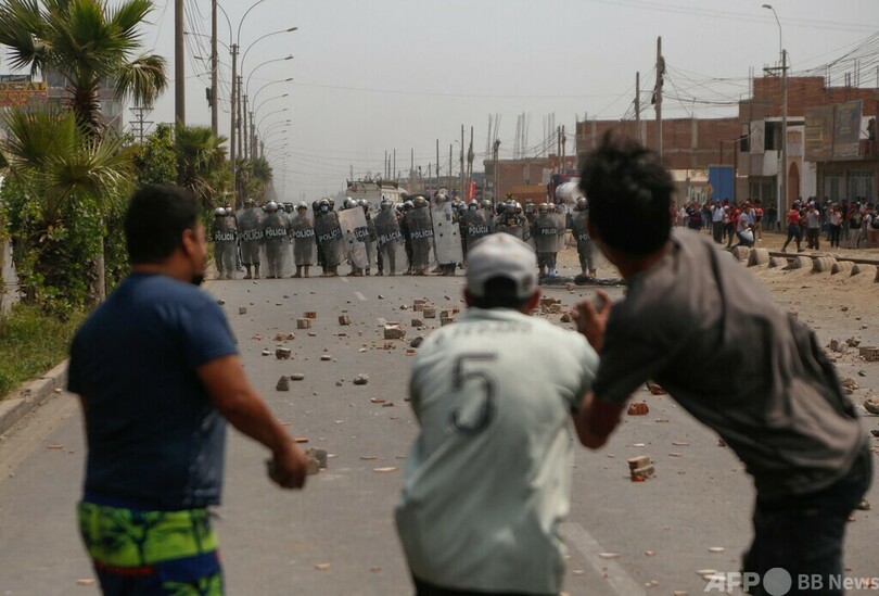 ペルーではここ数日、食料価格に加えて燃料価格も高騰し、高速料金が値上げされたため、全国で抗議デモが行われていた。政府は先週末、燃料高騰の緩和策として、燃料税を撤廃していた。(c)AFP