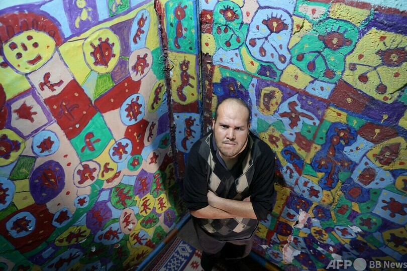 ムハメドさんは、父親のハサンさんが買ってくれたキャンバスを使い果たすと、自宅の室内や外壁に絵を描き始めた。(c)AFP