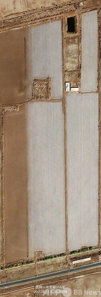 マルチフィルムやドリップかんがい施設を敷設する前に、地ならしをしなければなりません。動画衛星「吉林1号」が撮影した画像から、大型トラクターによるすき起こしで濃い色の新鮮な土壌が起こされ、周りの土地との色の違いがはっきりと分かります。トラクターの走行軌跡はまるで畑に絵を描いたように見えます。