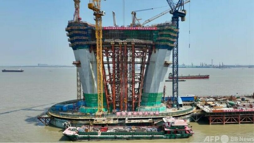 江蘇省(Jiangsu)の常州市(Changzhou)と泰興市(Taixing)を、長江をまたいで結ぶ常泰長江大橋は、高速道路と都市間鉄道を一体化したものです。2019年1月に着工し、工期は5年半の予定です。主橋部分は2階建てで1176メートルの斜張橋を採用し、専用橋部分はメインスパン388メートルの鋼アーチ橋となっており、いずれも同類の橋の世界記録を更新しています。(c)CGTN Japanese/AFPBB News