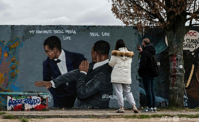 【4月10日 AFP】アカデミー賞(Academy Awards)授賞式で、米コメディアンのクリス・ロック(Chris Rock)さんに平手打ちをする俳優のウィル・スミス(Will Smith)さんをモチーフにした壁画を見る男性。「私のすてきなソーシャルメディアライフ」が「現実世界」から平手打ちされている。ベルリンを拠点に活動するストリートアーティストのエメ・フリーシンカー(Eme Freethinker)さんが描いた。ドイツ・ベルリンで。(c)AFP