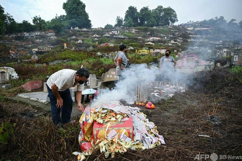 【4月14日 AFP】マレーシア・パハン(Pahang)州カラク(Karak)で、中国の伝統行事「清明節(Qingming Festival)」の前日に、墓地で先祖のためにお金に見立てた紙を燃やす中国系マレーシア人の男性。清明節は「墓掃除の日(Tomb Sweeping Day)」としても知られている。(c)AFP