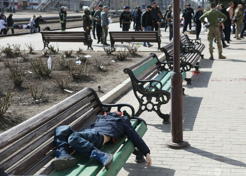 ロケット弾攻撃を受けたウクライナ東部クラマトルスク駅のプラットホームに横たわる遺体(2022年4月8日撮影)。(c)Anatolii STEPANOV / AFP