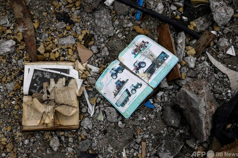 がれきの山に交じり、靴や本、水鉄砲、クッション、衣服が散乱している。クマ、キリン、カバのぬいぐるみが一列に並んでいた。