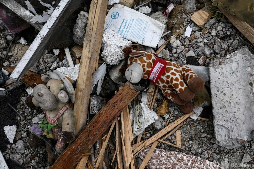 がれきの山に交じり、靴や本、水鉄砲、クッション、衣服が散乱している。クマ、キリン、カバのぬいぐるみが一列に並んでいた。