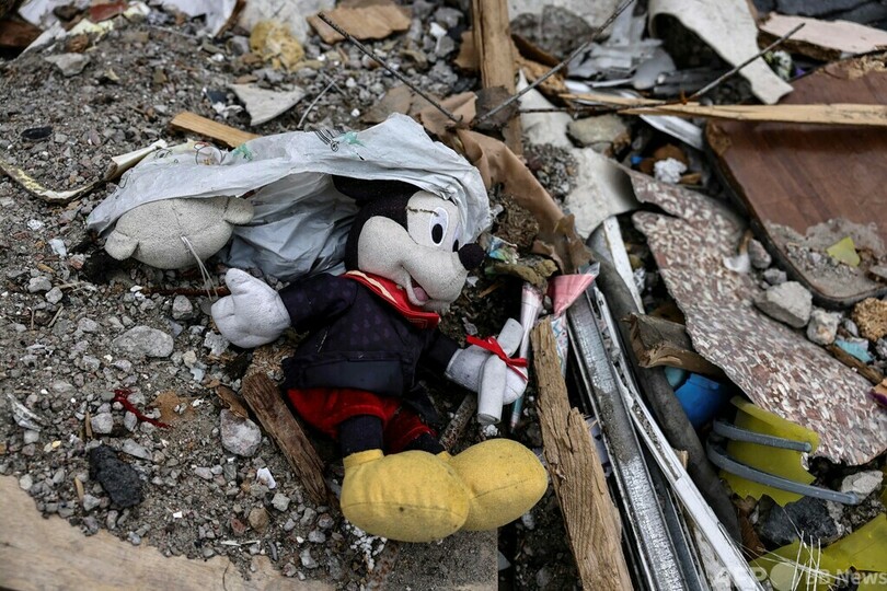 がれきの山に交じり、靴や本、水鉄砲、クッション、衣服が散乱している。クマ、キリン、カバのぬいぐるみが一列に並んでいた。
