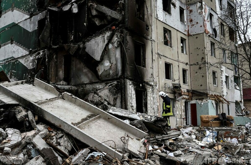 【4月10日 AFP】ウクライナの首都キーウの北西に位置するボロジャンカ(Borodyanka)。ロシア軍の砲撃を受けたアパートで、行方不明者の捜索が続いている。
