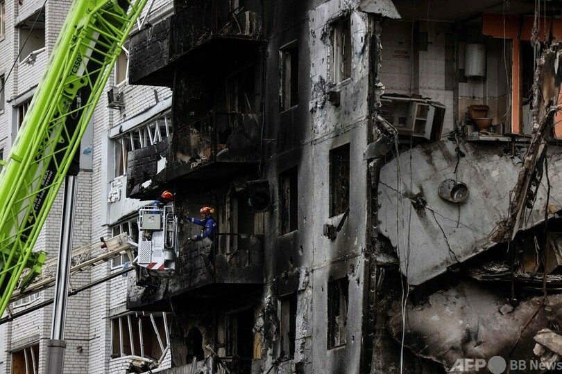 アントニーナさんの自宅は攻撃を免れた。だが、息子が住んでいた5階建ての建物は、ロシアの侵攻が始まってから数日後の3月1日夜、砲撃された。建物の真ん中にぽっかりと穴が開いている。