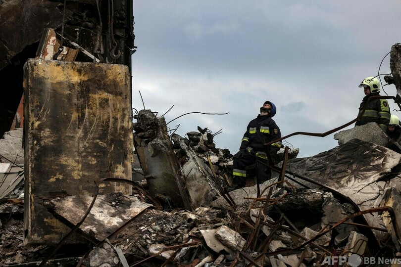 【4月10日 AFP】ウクライナの首都キーウの北西に位置するボロジャンカ(Borodyanka)。ロシア軍の砲撃を受けたアパートで、行方不明者の捜索が続いている。
