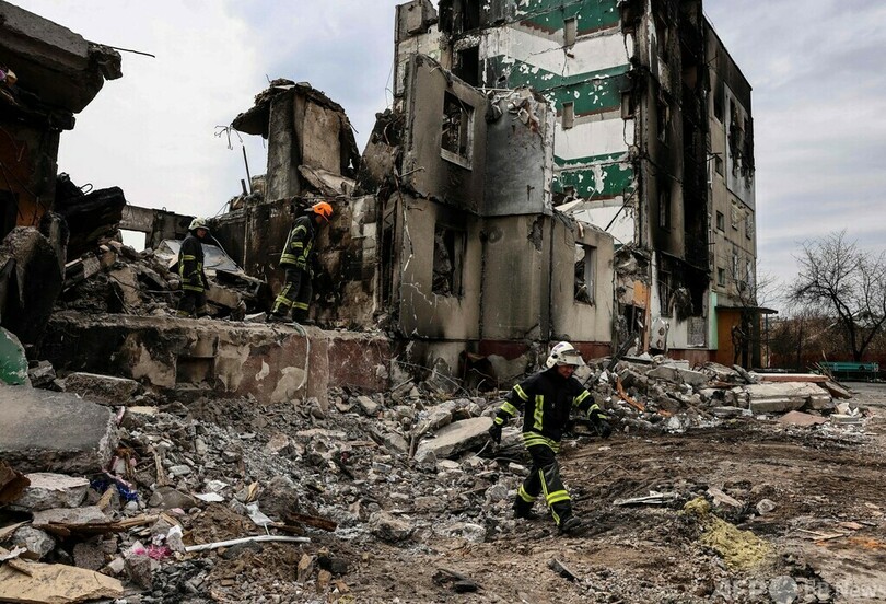 【4月10日 AFP】ウクライナの首都キーウの北西に位置するボロジャンカ(Borodyanka)。ロシア軍の砲撃を受けたアパートで、行方不明者の捜索が続いている。