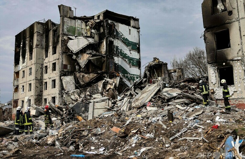 【4月10日 AFP】ウクライナの首都キーウの北西に位置するボロジャンカ(Borodyanka)。ロシア軍の砲撃を受けたアパートで、行方不明者の捜索が続いている。