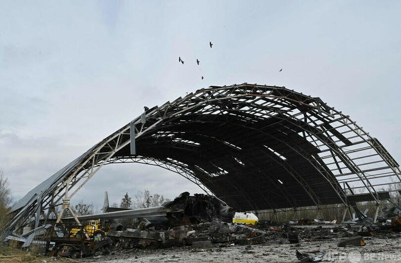 【4月11日 AFP】ウクライナの首都キーウ近郊のホストーメリ空港(Gostomel Airport)に駐機していた世界最大の航空機「アントノフAN225ムリーヤ」。屋根が吹き飛ばされた整備場の中、機首は崩れ落ち、大破している。その姿は、同空港を首都攻略の足掛かりにしようと試みたロシア軍との戦いの激しさを象徴している。