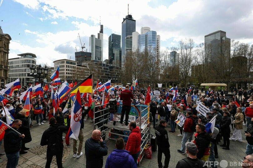 金融の中心地フランクフルトでは10日、約800人が参加する親ロシア派デモが行われた。参加者はロシアの国旗を手に、「憎悪と嫌がらせ」に抗議した。