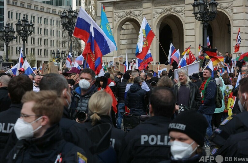 金融の中心地フランクフルトでは10日、約800人が参加する親ロシア派デモが行われた。参加者はロシアの国旗を手に、「憎悪と嫌がらせ」に抗議した。