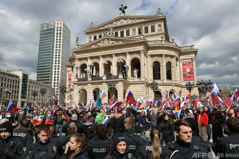 金融の中心地フランクフルトでは10日、約800人が参加する親ロシア派デモが行われた。参加者はロシアの国旗を手に、「憎悪と嫌がらせ」に抗議した。