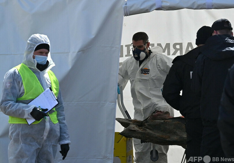 ここは、ブチャで見つかったものとしては最大の集団埋葬地だ。フランスから派遣された法医学捜査官ら18人が数日前から埋められていた遺体の検視と身元確認を進めている。