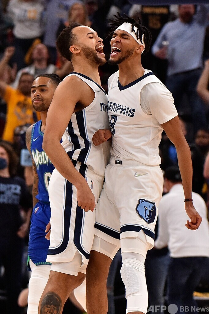 平均得点1位と2位の対決となったグリズリーズ対ティンバーウルブズ戦では、ウルブズのアンソニー・エドワーズ(Anthony Edwards)がプレーオフデビュー戦でゲームハイの36得点をマークし、カール・アンソニー・タウンズ(Karl-Anthony Towns)は29得点、13リバウンドを稼ぎ出した。(c)AFP