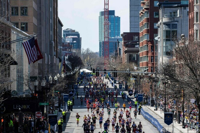 ボストン・マラソンは今年から再び伝統の4月の第3月曜日に開催。新型コロナウイルスの影響により2020年は中止、昨年は10月開催になっていた。今年は定員の3万人が参加し、エントリーには新型コロナウイルスワクチンの接種証明が義務付けられた。(c)AFP
