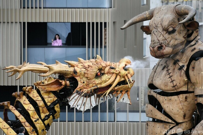【4月25日 AFP】フランス南部トゥールーズ(Toulouse)の通りで、フランソワ・ド・ラ・ロジエ(Francois de la Roziere)氏が率いる劇団「ラ・マシーヌ(La Machine)」が作ったドラゴンホース「ロンマ(Long-Ma、龍馬)」を見上げる観客。よみがえったロンマが博物館「アール・デ・マシーヌ(Halle des Machines)」のミノタウロス(Minotaur)と対面するという筋書きで、ロンマが同市の通りを移動している時の一コマ。(c)AFP