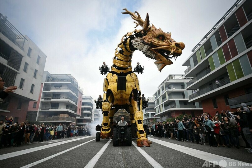 【4月25日 AFP】フランス南部トゥールーズ(Toulouse)の通りで、フランソワ・ド・ラ・ロジエ(Francois de la Roziere)氏が率いる劇団「ラ・マシーヌ(La Machine)」が作ったドラゴンホース「ロンマ(Long-Ma、龍馬)」を見上げる観客。よみがえったロンマが博物館「アール・デ・マシーヌ(Halle des Machines)」のミノタウロス(Minotaur)と対面するという筋書きで、ロンマが同市の通りを移動している時の一コマ。(c)AFP